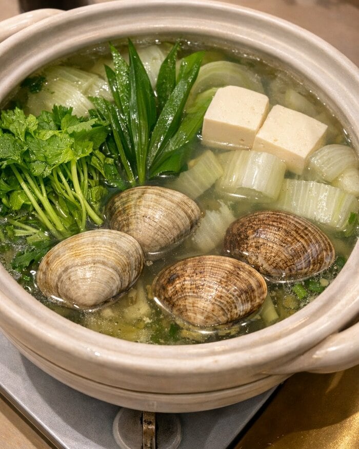 鍋の中には、メインのハマグリに豆腐、緑が映える野菜がどっさり入っていて、体がポカポカになりそうです。ハマグリのだしが効いたつゆは透き通った見た目で、思わずおなかが空いてしまいますね。