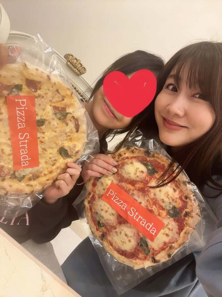 隣に立つ長女もピザを手に持ち、ハートのスタンプで隠された顔の下からのぞく口元は、母親と同じように楽しげにほころんでいるようです。