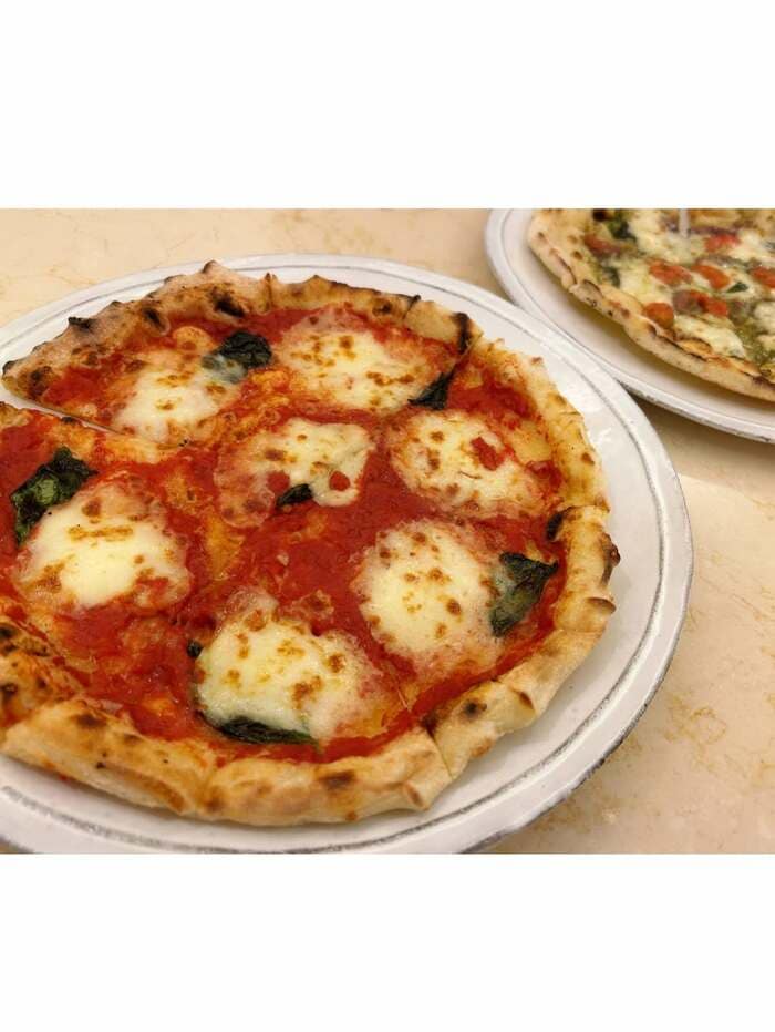 白いお皿に乗せられたピザは、鮮やかなトマトソースの上にモッツァレラチーズとバジルがトッピングされており、こんがり焼けた生地も相まって食欲をそそります♪