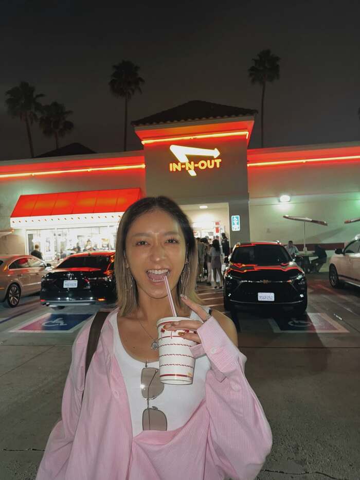 夜の駐車場を背景にしたショットでは、カップを片手に持ち、ストローを口元に寄せながら弾けるような笑顔を披露。口を怪獣のように大きく開けて、ジャンクフードを楽しむ表情に、見ているこちらもつられて笑顔になってしまいそうです。