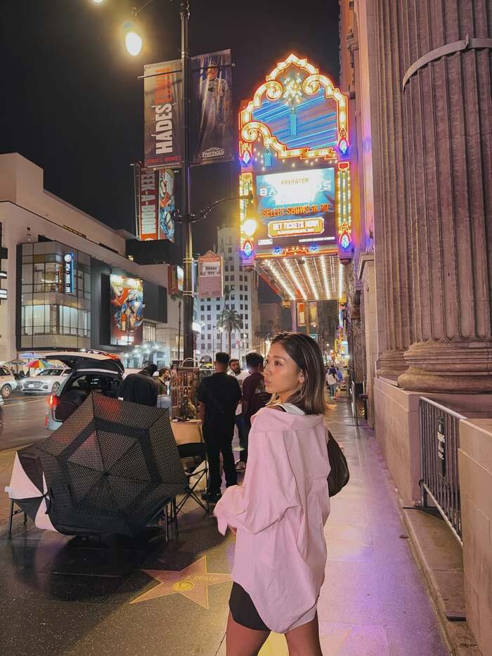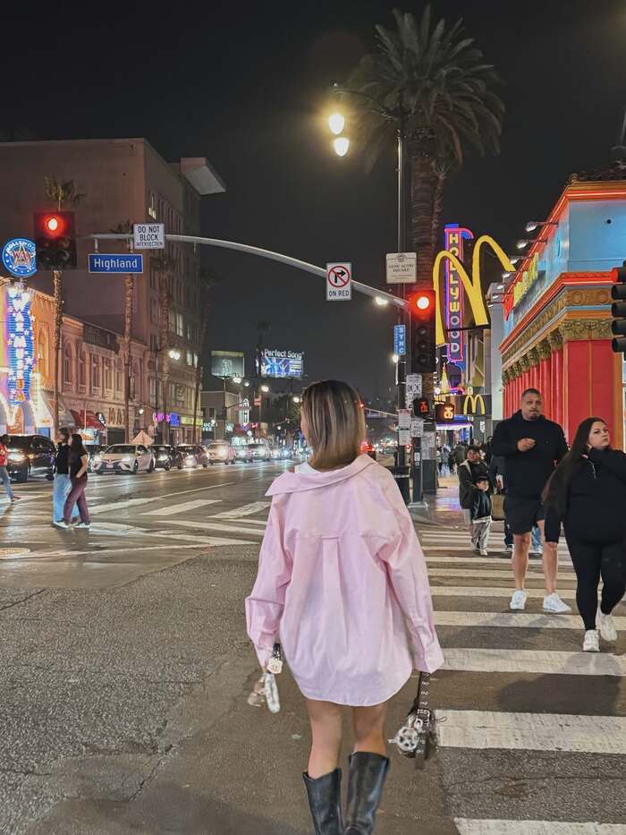 さらに、オーバーサイズのシャツを着崩し、黒のブーツを合わせたコーディネートで、ハンバーガーショップの前に立つショットも。