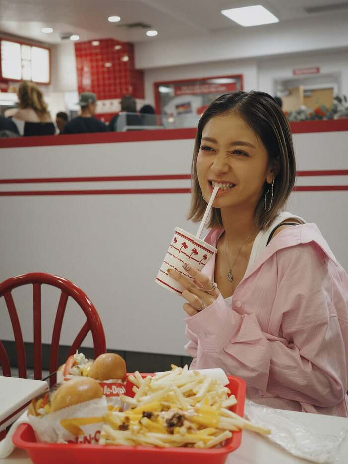 ハンバーガーショップの店内では、チーズソースがかかったフライドポテトとバーガーが置かれた赤いトレイを前に、飲み物を口に運ぶ姿を見せています。ストローを噛みながらクシャッとた表情を浮かべており、楽しそうな雰囲気が伝わってきます。