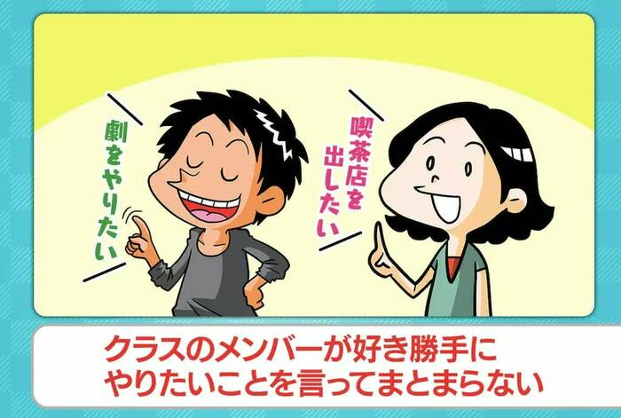 まず紹介されたのは、クラス委員を担当している男性の「文化祭の出し物の話し合いで、みんなが好き勝手言っていてまとまらない」というお悩みです。