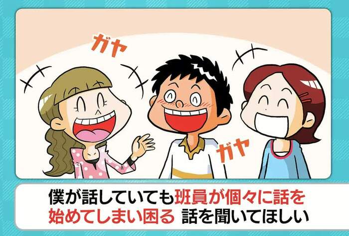 「グループ学習の班長になったのだが、みんなが個々に話を始めて困る。話を聞いてもらうにはどうするべき?」という、お悩みも登場しました。