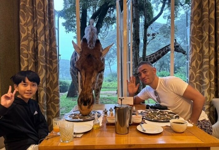 投稿された写真には、大きなキリンを眺めながら外でティータイムを楽しむ新之助さんの後ろ姿がとらえられています。