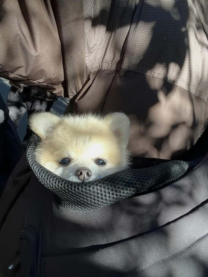 投稿で公開した写真には、ブラウンのダウンにサングラスをかけたスタイルの佐藤さんが肩がけのキャリーバッグを身につけていて、その中にはなちゃんがすっぽりと入っているのがわかります!
