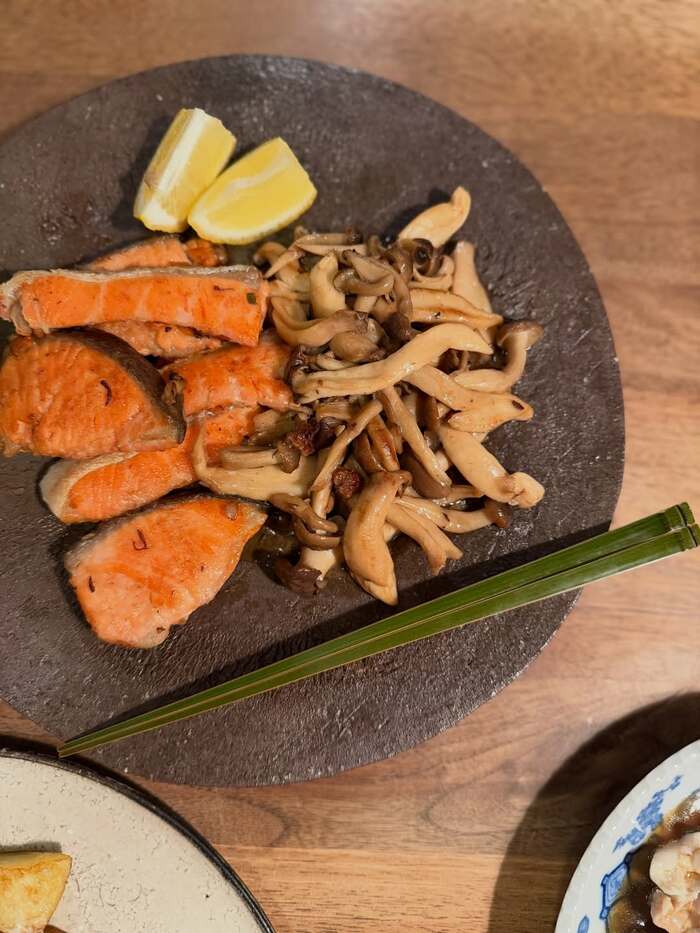 重厚感のある黒いお皿には、レモンが添えられ、食べやすい大きさにカットされた焼き鮭と、ぶなしめじのソテーが。