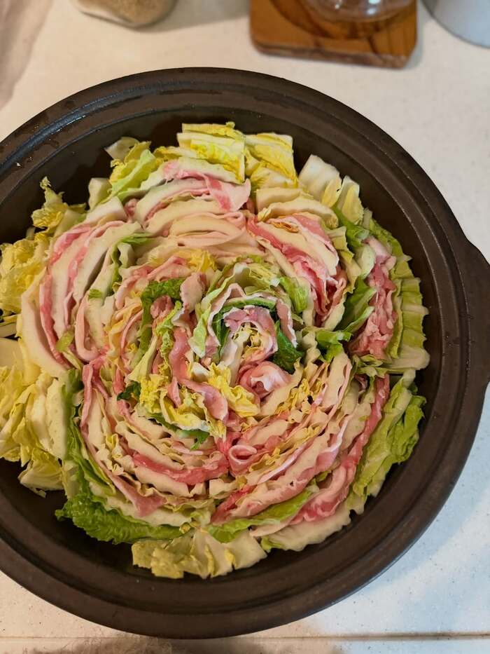 豚肉と白菜が渦状にぎっしりと重ねられたお鍋が、存在感を放っています!