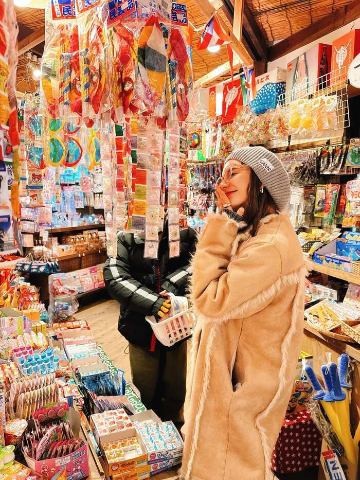 スザンヌ 湯布院旅行で昔懐かしい駄菓子に囲まれる姿
