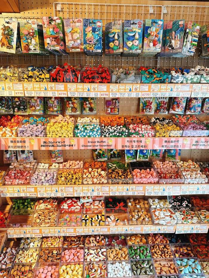さらに動物やお寿司などの形をしたカラフルな消しゴムがずらりと並んだコーナーも。「消しゴムバイキング」と書かれた案内札があり、好きなものを選ぶ楽しさを味わえるようです。