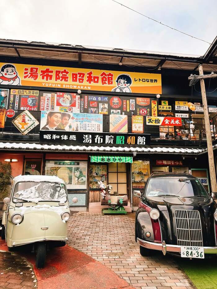 そんなスザンヌさんたちが旅の途中で立ち寄ったのは「湯布院昭和館」という昭和の懐かしい雰囲気を味わえる人気の観光施設。木造二階建ての建物に多数の看板やポスターが貼られ、昭和レトロな雰囲気を醸し出しています。