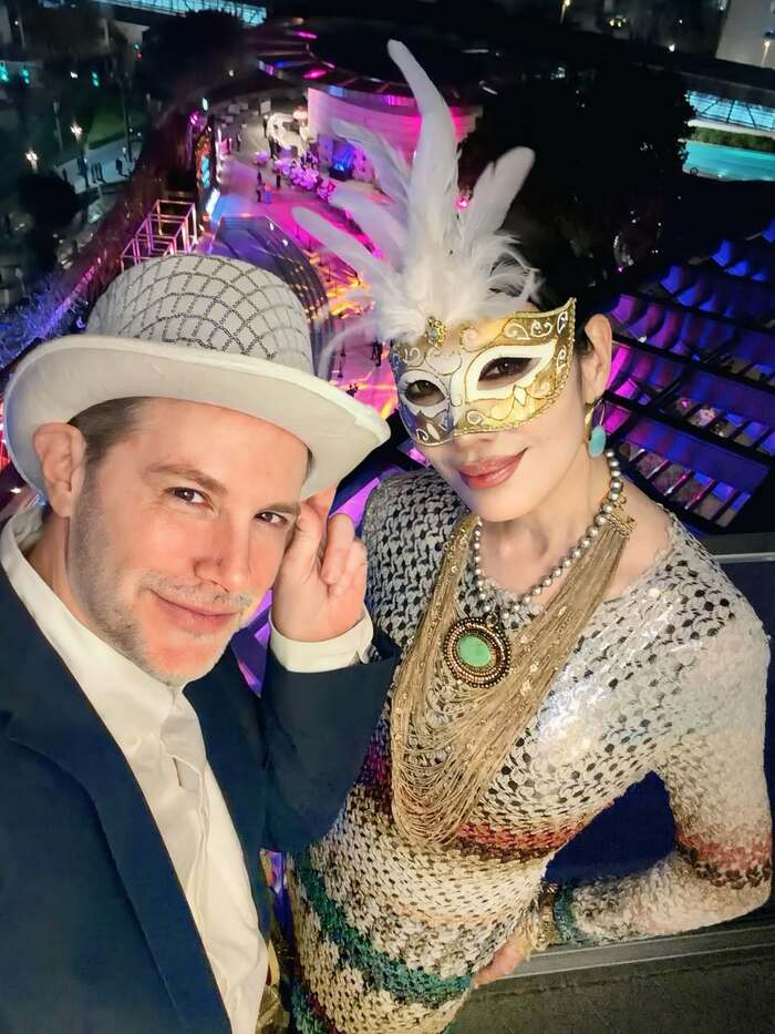 他にも、スパンコールが全身にちりばめられたドレスを着て、目元に仮面をつけた姿で夫と並んだショットや…