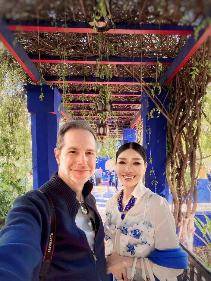 夫婦で旅行に出かけたときに撮影したのか、さわやかな装いでサングラスをかけ、リラックスした表情が印象的です。