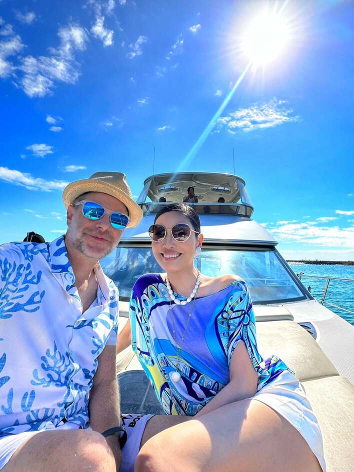 公開された写真を見てみると、青く澄み渡った海でクルーザー乗ったアン ミカさんと夫が顔を寄せながら笑顔を浮かべる様子が。