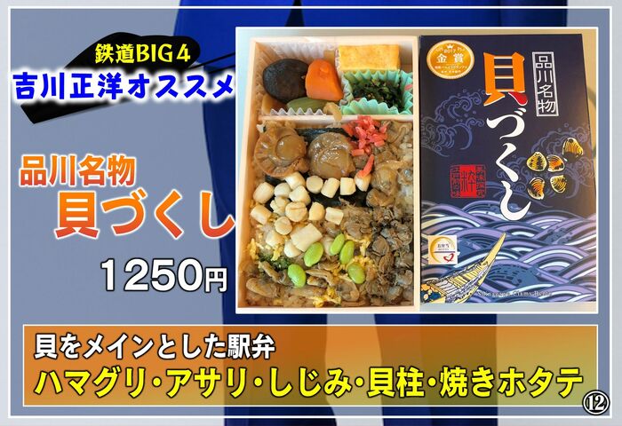お肉とか、お魚というお弁当が多い中で貝に焦点を当てている。そしてこの貝が具だくさんで5つの貝が入っておりましてそれぞれ味付けが違って、ボリュームもあって、茶飯もおいしいと。東京とか品川で買って、「これから旅に行くぞ出発進行!」という感じですね。
