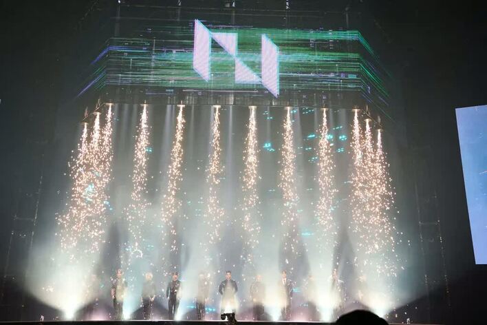オープニング映像が流れ、観客の期待感も最高潮に高まったところで、火花と共にINIが登場。デビュー曲「Rocketeer」、そして「Cardio」「BOMBARDA」と気迫のこもったパフォーマンスを披露して会場を沸かせます。