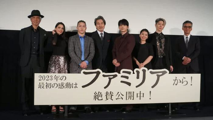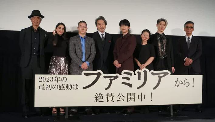 映画「ファミリア」の公開記念舞台挨拶が行われ、役所広司さん、吉沢亮さん、サガエルカスさん、ワケドファジレさん、アリまらい果さん、MIYAVIさん、佐藤浩市さん、成島出監督が登壇しました。