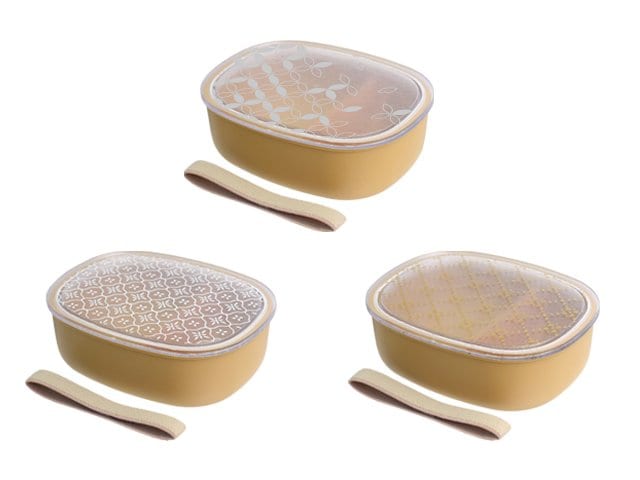 - フタにすりガラスのような印象。透明なフタに凹凸の加工がされていて、モダンな柄がプリントされています。白木風の容器との組み合わせはみずみずしく新鮮な印象。フタには柄がプリントされています。古い窓ガラスや切子ガラス模様から着想を得た模様です。