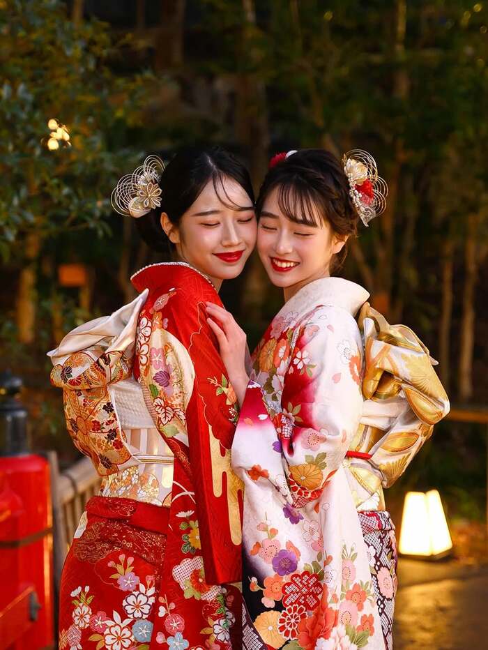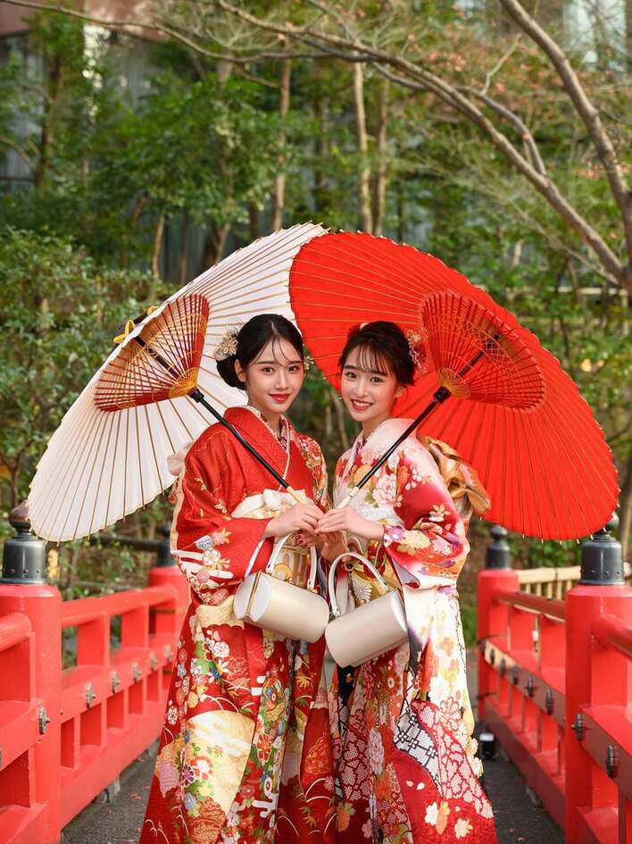 写真には、袖辺りに花柄が集中した真っ赤な振り袖姿の天⾳さん、全体に花柄が施され、赤と白のグラデーションになった振り袖姿の舞衣さんが収められています。