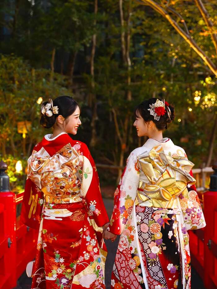 また、より華やかさを際立たせてくれる帯に目を奪われる後ろ姿のショットでは、笑顔で見つめ合い手をつないでいます。