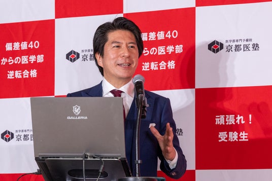 まず、京都医塾について「『教育は、一人のために生まれる。』を理念に、偏差値40からの医学部逆転合格を目指す日本一面倒見が良い医学部専門予備校です。1986年に創立し、今年で40周年を迎え、全国から多くの医学部受験生が集まってきてくれています」と紹介しました。