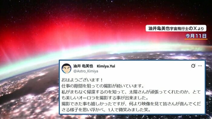 中でも、地球への帰還直前である1月11日に撮影された、オーロラの映像が話題となっています。