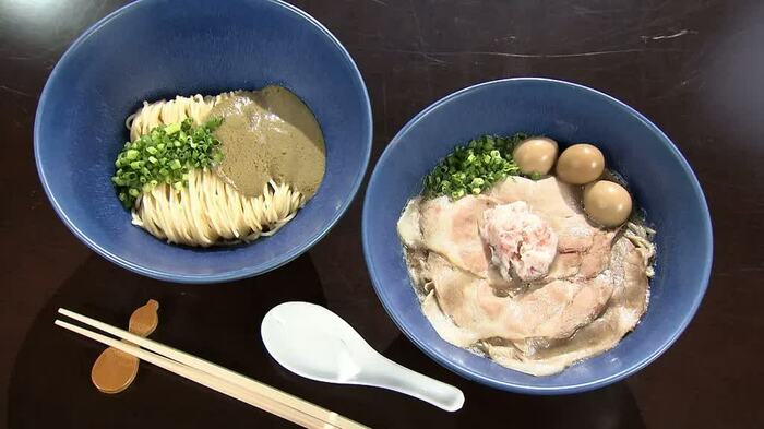 「まずは、まぜそばのようにして和えてそのまま食べてほしい」と促された松岡さんは、和え玉を混ぜてすするってみると、またもや目を見開いて「想像を超えましたね」とびっくり。