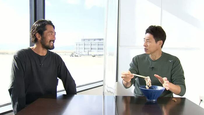 続いて、先ほど残ったスープに入れてつけ麺スタイルで食べた松岡さんは、「ラーメンを食べている感じはまったくないですね、おいしいお蕎麦ですこれは」と頷き、「米子に来たら空港だけでよくなってきました」と、すっかり満足していました。
