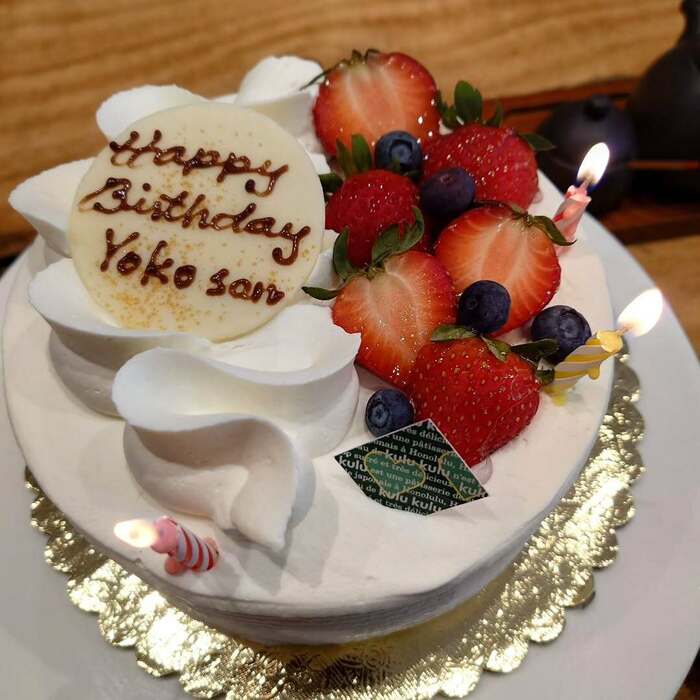 波のようなデザインの生クリームの上に、「Happy Birthday Yoko san」とチョコレートで書かれたプレートも用意されていて、テンションが高まってしまいます。