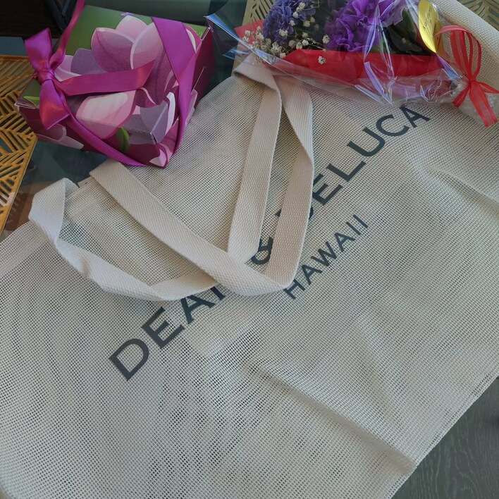 プレゼントをもらったようで、使い勝手が良さそうなトートバッグや鮮やかな紫色の花束をテーブルに並べています。リボンが付いた小さなプレゼントボックスもあり、中身が気になります。