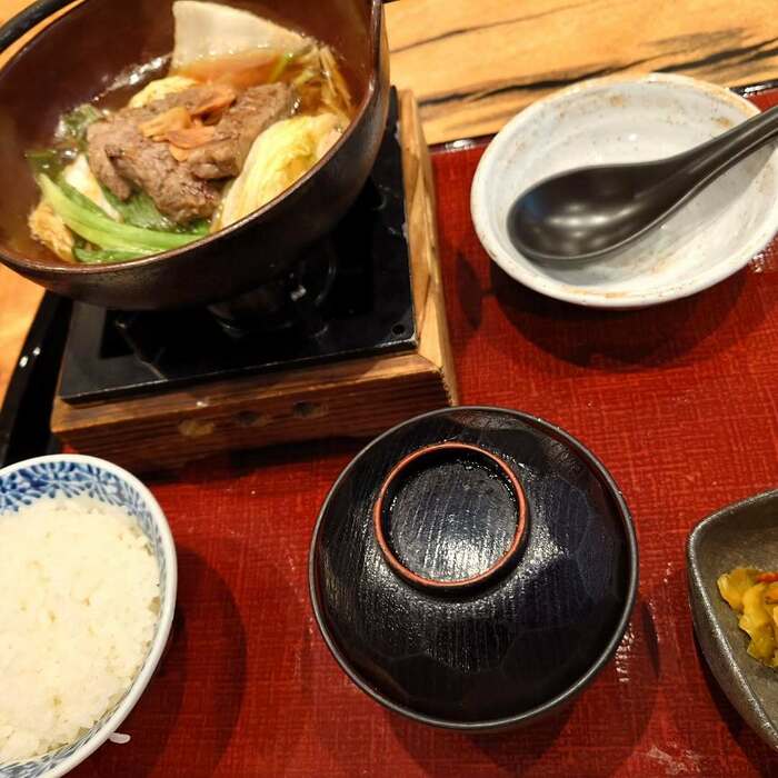 別のショットを見ると、ぐつぐつと煮込まれるおいしそうな肉鍋が登場!白菜や鮮やかな緑色の葉物もあり、野菜がたっぷりです。手前にはつやつやな白米やおみそ汁もあり、心も体も大満足ですね。