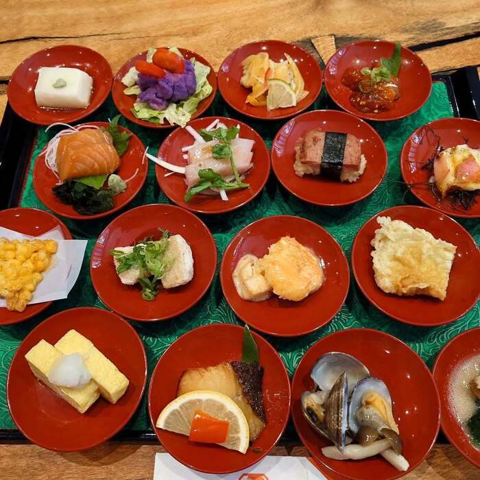 サーモンやランチョンミートをのせたお寿司、とうもろこしの揚げ物や味が染みた魚など、どれも一口サイズになっていて、なんともぜいたくです。