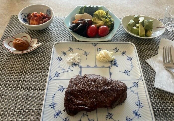 わさびが西洋わさびに変化しているようにも見えますが、その他はいつもと同じラインナップでがっつりのステーキ肉と栄養バランスばっちりな副菜がテーブルの上に並んでいます。