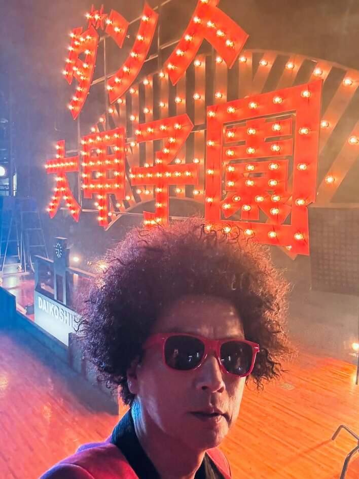 ボリュームたっぷりのアフロヘアに、鮮やかな赤いサングラスをかけ、スマートフォンで自撮りをする椎名さん。背景の「ダンス大甲子園」と書かれた赤いネオンサインが、怪しげでファンキーな雰囲気を一層際立たせています。