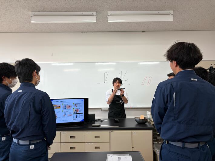 - 内容 :包丁の種類、正しい使い方、手入れの仕方(両刃・片刃)などをお伝えし、学生には実際に包丁研ぎも体験いただきました。