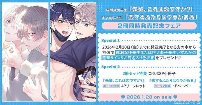 ホーリンラブブックスでは成瀬なゆ先生「先輩、これは恋ですか?」&桃ノ李子先生「恋するふたりはウラがある」2冊同時発売を記念して、豪華キャンペーンを実施いたします!