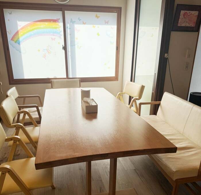 窓のガラスには、カラフルな蝶や虹がデザインされ、かわいらしい見た目で気分がアップしますね。