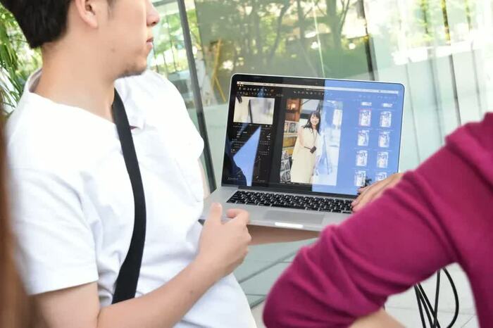 「ダンスができると聞いたので、ポージングも躍動感が出せるんじゃないかな」と新美Pが期待したとおり、一度アドバイスしただけで、みるみる緊張がほぐれ、リラックスムードに。だんだん自然な笑顔が溢れ始めた。