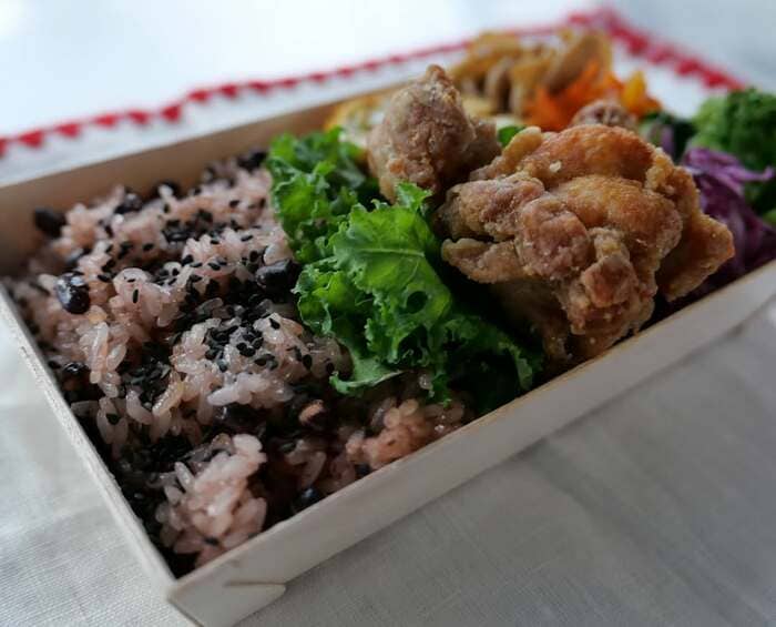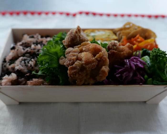 中央にはこんがりと揚がった唐揚げが鎮座し、その周りにはお赤飯、紫キャベツ、オレンジ色のキャロットラペ、春の訪れを感じさせる菜の花などがバランス良く盛り付けられています。