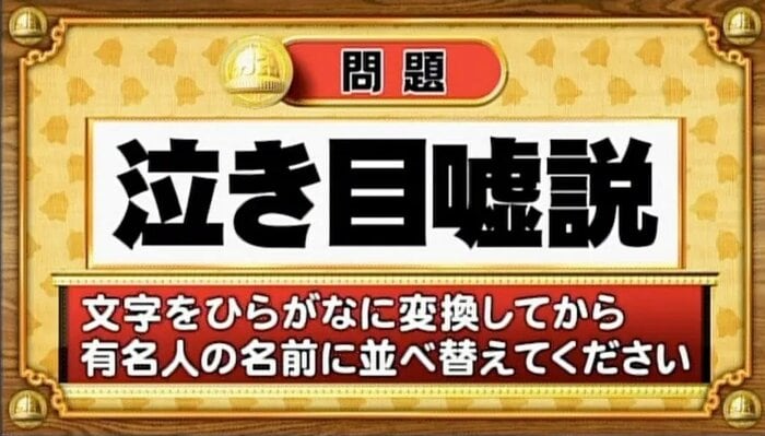 「泣き目嘘説」。この文字をひらがなに変換してから、ある有名人の名前に並べ替えてください。