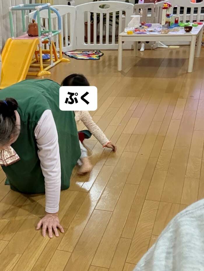 まずは、「針から帰宅したらお母さんが馬になって後ろに隠れるぷくぷく」とつづられた“ぷくぷくちゃん”とおばあちゃんの2ショット。おばあちゃんは手や膝を床につき、四つんばいになっていて全力で馬になりきっていて、その後ろで“ぷくぷくちゃん”がおばあちゃんの“馬”に隠れるような、なんともほほ笑ましい光景が写し出されています。