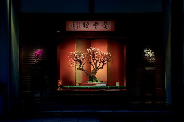 続く新館では、1点1点の盆梅をまるでアート作品のように魅せるこれまでにない展示演出を行っています。盆梅そのものの造形美や生命力をより深く感じていただける空間となっています。