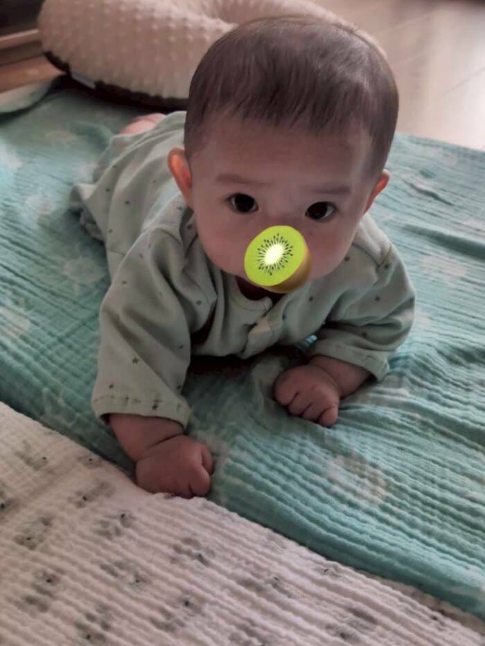 お兄ちゃんはうつぶせ姿勢で、涙袋をぷっくりとさせながら、ニコニコ笑顔を披露!