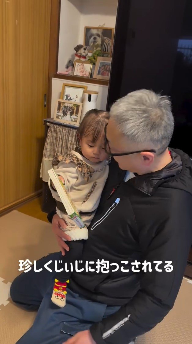 家ではおじいちゃんにぎゅっと抱きつき、抱っこ!にこりちゃんの手には本が握られていて、興味津々な様子で表紙を見つめています。