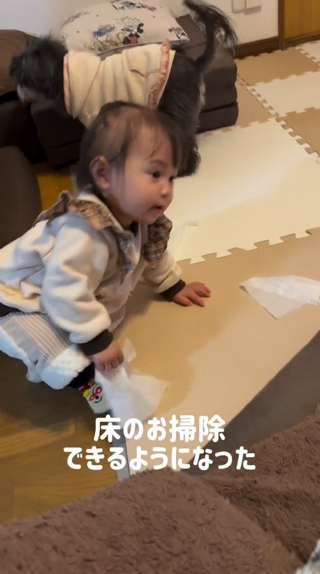さらに、床のお掃除をする姿も。にこりちゃんは、ジョイントマットの上をじっと見つめ、ティッシュでふきふき!その後ろ姿は真剣そのものです。