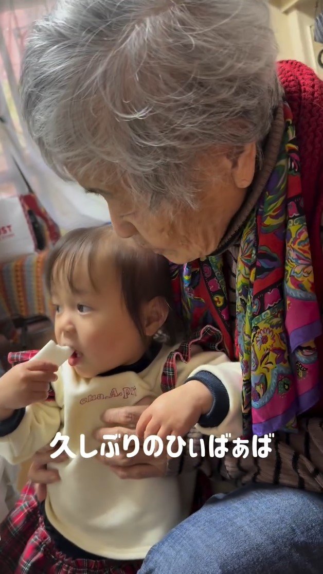 そして、ひいおばあちゃんに体を支えられながら、白いおせんべいのようなものをパクッと食べているショットも。仲むつまじい様子に、心がほっこりしますね。