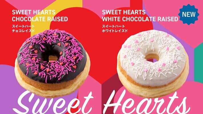 このたび新発売する『スイートハート チョコレイズド』は、濃厚な甘さのチョコアイシングに赤のハート型とピンクのスプリンクルを、『スイートハート ホワイトレイズド』は、優しい甘さのホワイトチョコにピンクのハート型と白のスプリンクルをトッピングしました。華やかでかわいい見た目がバレンタインデーやホワイトデーのギフトなどにも最適な季節限定ドーナツです。