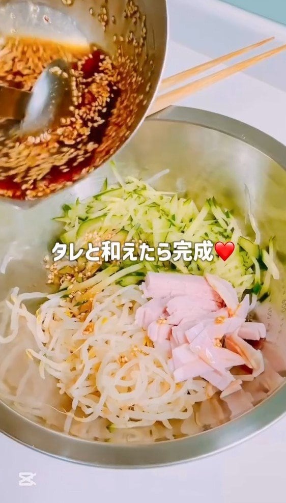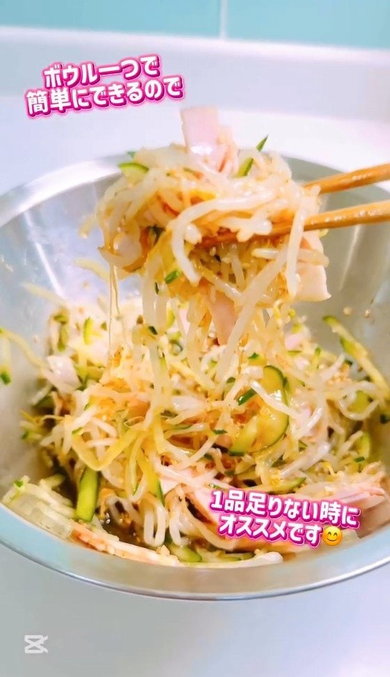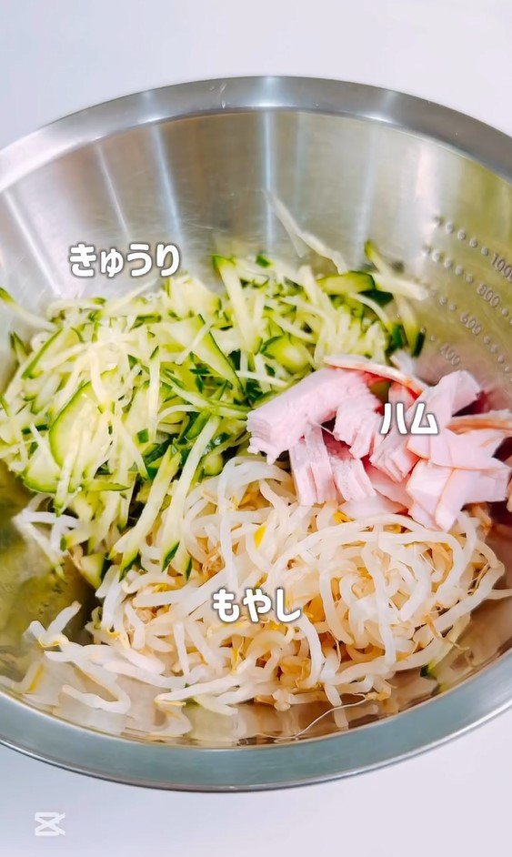 そして、ボウルの中には先ほど用意したもやしとキュウリ、さらに短冊切りにされたハムを入れ…
