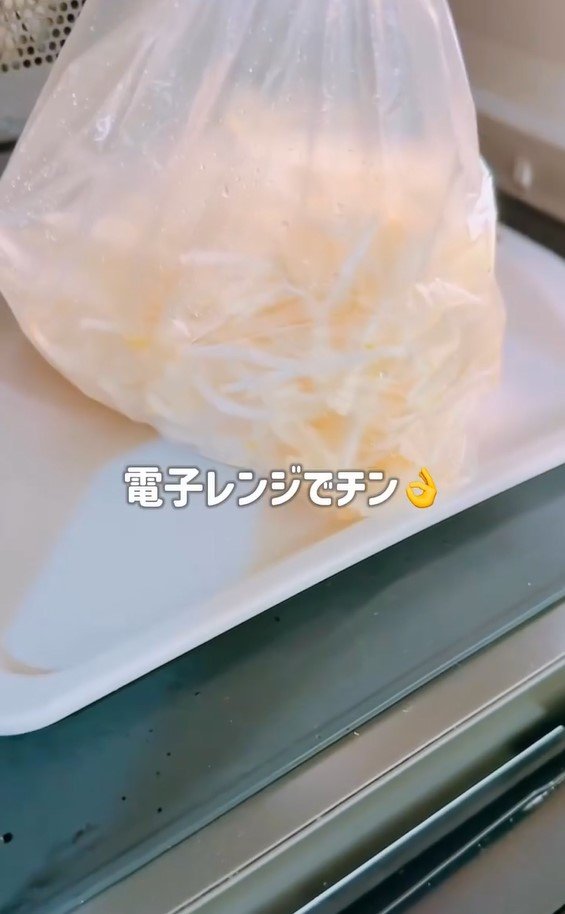 まずは、ポリ袋にいれたもやしを電子レンジでチン。