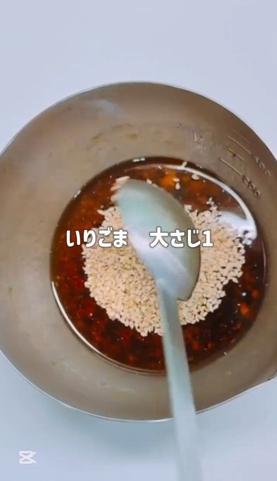 お酢大さじ3、砂糖大さじ2.5、しょうゆ大さじ1.5、ごま油大さじ2、おろしショウガ適量、いりごま大さじ1をカップで混ぜて、タレが完成!